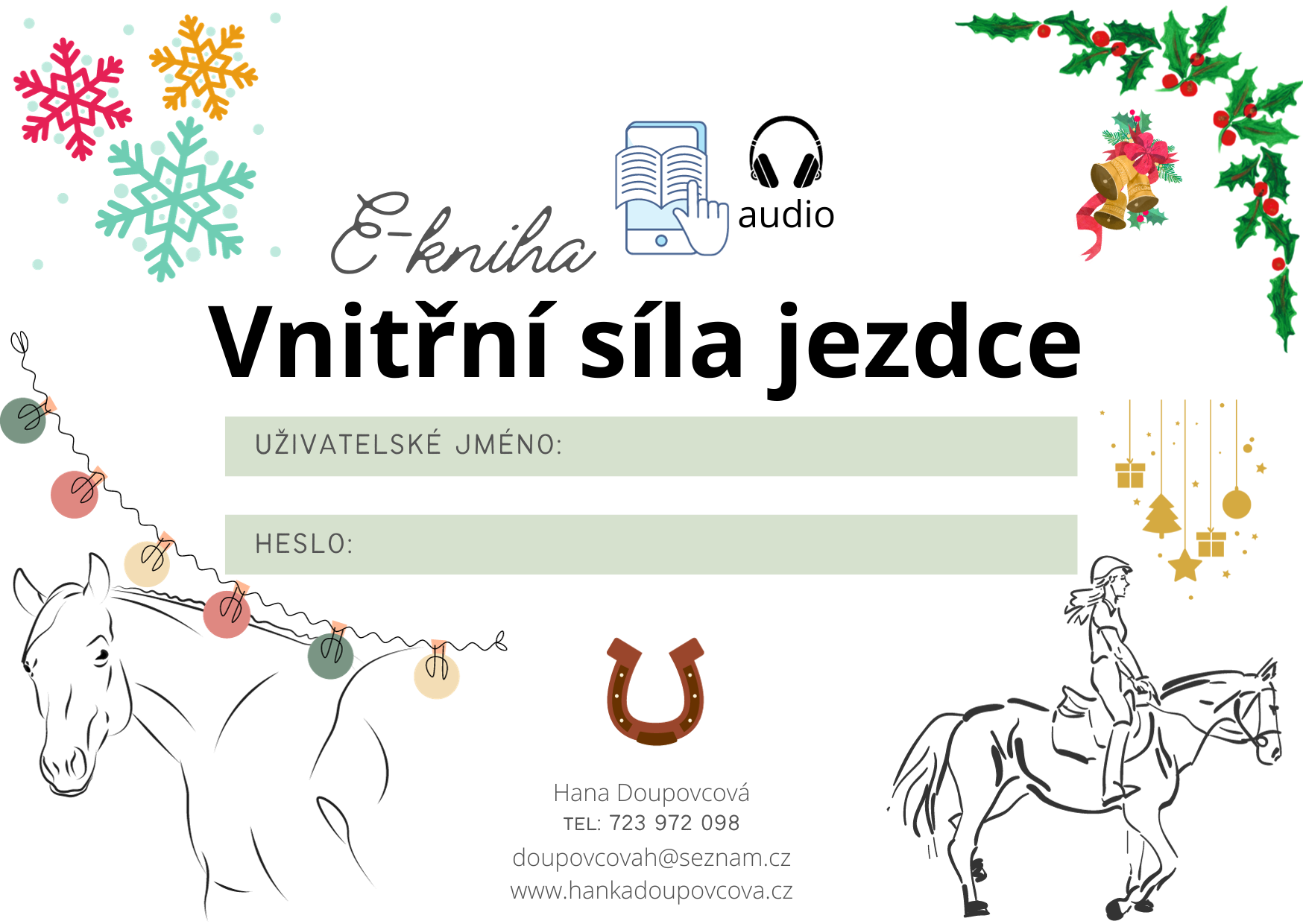 Jak to funguje? Stáhněte si poukaz níže a vepište do něj heslo a uživatelské jméno, které vám po zakoupení E-knihy přijde na váš e-mail. Můžete tak věnovat poukaz na E-knihu jako dárek. Pokud máte dotaz, kontaktujte mě na e-mail: doupovcovah@seznam.cz nebo tel: 723 972 098