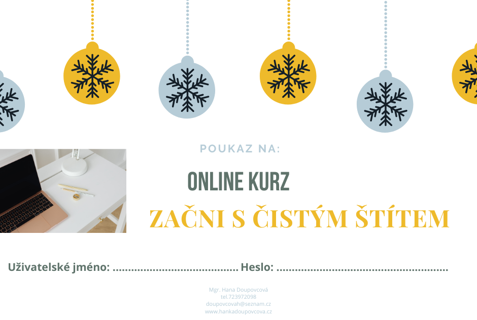 Jak to funguje? Stáhněte si poukaz níže a vepište do něj heslo a uživatelské jméno, které vám po zakoupení online kurzu přijde na váš e-mail. Můžete tak věnovat poukaz jako dárek. Pokud máte dotaz, kontaktujte mě na e-mail: doupovcovah@seznam.cz nebo tel: 723 972 098